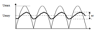 Le taux d’ondulation est déterminé par le rapport entre la réactance de la bobine et la valeur de la résistance de charge. On néglige cependant l’effet des harmoniques supérieures.er = Umax x Rc / (Rc + XL) (à 100Hz)