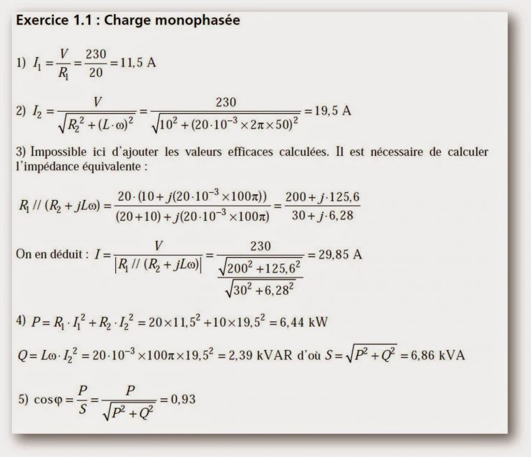 "<h4><img class=\"wp-image-2785 aligncenter\" src=\"http:\/\/genieelectromecanique.com\/wp-content\/uploads\/2020\/02\/Exercices-d\u2019application-re\u0301solus-CIRCUITS-MONOPHASE\u0301S-760x398.jpg\" alt=\"\" width=\"623\" height=\"326\" \/><\/h4>\r\n<h4><u>Exercice 1 : Charge monophas\u00e9e<\/u><\/h4>\r\nOn consid\u00e8re la\u00a0<i>charge monophas\u00e9e<\/i>\u00a0repr\u00e9sent\u00e9e sur la figure 1.18, plac\u00e9e sous une\r\n<i>tension sinuso\u00efdale<\/i>\u00a0de valeur efficace V = 230 V et de fr\u00e9quence 50 Hz.\r\n<div class=\"separator\"><a href=\"https:\/\/1.bp.blogspot.com\/-VGoJxIqfQ6I\/VGEu2F9kQyI\/AAAAAAAAAbc\/r00w8qprleg\/s1600\/EXERCICE%2BCIRCUITS%2BMONOPHAS%C3%89S.jpg\"><img title=\"EXERCICE CIRCUITS MONOPHAS\u00c9S\" src=\"https:\/\/1.bp.blogspot.com\/-VGoJxIqfQ6I\/VGEu2F9kQyI\/AAAAAAAAAbc\/r00w8qprleg\/s1600\/EXERCICE%2BCIRCUITS%2BMONOPHAS%C3%89S.jpg\" alt=\"EXERCICE CIRCUITS MONOPHAS\u00c9S\" width=\"320\" height=\"129\" border=\"0\" \/><\/a><\/div>\r\n \r\n<ol type=\"1\">\r\n \t<li style=\"list-style-type: none;\">\r\n<ol type=\"1\">\r\n \t<li>Calculer la\u00a0<i>valeur efficace<\/i>\u00a0du courant circulant dans la r\u00e9sistance R1 .<\/li>\r\n<\/ol>\r\n<\/li>\r\n<\/ol>\r\n \r\n<ol type=\"1\">\r\n \t<li style=\"list-style-type: none;\">\r\n<ol type=\"1\">\r\n \t<li>Calculer la<i>\u00a0valeur efficace<\/i>\u00a0du courant circulant dans la r\u00e9sistanceR2 .<\/li>\r\n<\/ol>\r\n<\/li>\r\n<\/ol>\r\n \r\n<ol type=\"1\">\r\n \t<li style=\"list-style-type: none;\">\r\n<ol type=\"1\">\r\n \t<li>Calculer la\u00a0<i>valeur efficace<\/i>\u00a0du courant absorb\u00e9 par l\u2019ensemble de ce circuit.<\/li>\r\n<\/ol>\r\n<\/li>\r\n<\/ol>\r\n \r\n<ol type=\"1\">\r\n \t<li style=\"list-style-type: none;\">\r\n<ol type=\"1\">\r\n \t<li>Calculer la valeur des\u00a0<i>puissances active P<\/i>,\u00a0<i>r\u00e9active Q et apparente S relatives<\/i>\u00a0\u00e0 ce\r\ncircuit.<\/li>\r\n<\/ol>\r\n<\/li>\r\n<\/ol>\r\n \r\n<ol type=\"1\">\r\n \t<li style=\"list-style-type: none;\">\r\n<ol type=\"1\">\r\n \t<li>En d\u00e9duire la valeur du\u00a0<i>facteur de puissance<\/i>\u00a0de cette charge.<\/li>\r\n<\/ol>\r\n<\/li>\r\n<\/ol>\r\n \r\n\r\n \r\n<h4><u>Exercice 2 Repr\u00e9sentation vectorielle des courants et tensions<\/u><\/h4>\r\nOn consid\u00e8re le circuit repr\u00e9sent\u00e9 sur la figure 1.19 o\u00f9 est la repr\u00e9sentation\r\ncomplexe d\u2019une tension sinuso\u00efdale de valeur efficace V = 100 V et de fr\u00e9quence\r\n50 Hz. Les composants de ce circuit sont directement caract\u00e9ris\u00e9s par la valeur de\r\nleur imp\u00e9dance complexe.\r\n<div class=\"separator\"><a href=\"https:\/\/3.bp.blogspot.com\/-pBUibbGa9Dc\/VGEvt6CSmVI\/AAAAAAAAAbk\/P751Cxuj6EY\/s1600\/Exercice%2BRepr%C3%A9sentation%2Bvectorielle%2Bdes%2Bcourants%2Bet%2Btensions.jpg\"><img title=\"Exercice Repr\u00e9sentation vectorielle des courants et tensions\" src=\"https:\/\/3.bp.blogspot.com\/-pBUibbGa9Dc\/VGEvt6CSmVI\/AAAAAAAAAbk\/P751Cxuj6EY\/s1600\/Exercice%2BRepr%C3%A9sentation%2Bvectorielle%2Bdes%2Bcourants%2Bet%2Btensions.jpg\" alt=\"Exercice Repr\u00e9sentation vectorielle des courants et tensions\" width=\"320\" height=\"128\" border=\"0\" \/><\/a><\/div>\r\n \r\n<ol type=\"1\">\r\n \t<li style=\"list-style-type: none;\">\r\n<ol type=\"1\">\r\n \t<li>Calculer la valeur efficace I du courant .<\/li>\r\n<\/ol>\r\n<\/li>\r\n<\/ol>\r\n \r\n<ol type=\"1\">\r\n \t<li style=\"list-style-type: none;\">\r\n<ol type=\"1\">\r\n \t<li>Calculer la phase du courant I si on consid\u00e8re la tension V \u00e0 l\u2019origine des\r\nphases. \u00c9crire alors l\u2019expression temporelle de la tension v et du courant i.<\/li>\r\n<\/ol>\r\n<\/li>\r\n<\/ol>\r\n \r\n<ol type=\"1\">\r\n \t<li style=\"list-style-type: none;\">\r\n<ol type=\"1\">\r\n \t<li>\u00c9crire la loi de maille qui r\u00e9git ce circuit.<\/li>\r\n<\/ol>\r\n<\/li>\r\n<\/ol>\r\n \r\n<ol type=\"1\">\r\n \t<li style=\"list-style-type: none;\">\r\n<ol type=\"1\">\r\n \t<li>Repr\u00e9senter tous les complexes formant cette loi de maille sur un diagramme\r\nvectoriel dans le plan complexe (diagramme de Fresnel).<\/li>\r\n<\/ol>\r\n<\/li>\r\n<\/ol>\r\n \r\n\r\n \r\n<h3 style=\"text-align: center;\"><b><a href=\"http:\/\/genieelectromecanique.com\/exercices-dapplication-resolus-circuits-monophases\/2\/\" target=\"_blank\" rel=\"noopener noreferrer\">CORRECTION\u00a0Exercice 1<\/a><\/b><\/h3>\r\n<h3 style=\"text-align: center;\"><b><\/b><a href=\"http:\/\/genieelectromecanique.com\/exercices-dapplication-resolus-circuits-monophases\/3\/\" target=\"_blank\" rel=\"noopener noreferrer\"><b>CORRECTION\u00a0Exercice 2<\/b><\/a><\/h3>\r\n<!--nextpage-->\r\n<h3 style=\"text-align: center;\"><span style=\"color: #ff0000;\"><b>CORRECTION\u00a0Exercice 1<\/b><\/span><\/h3>\r\n<img class=\"size-medium wp-image-2786 aligncenter\" src=\"http:\/\/genieelectromecanique.com\/wp-content\/uploads\/2020\/02\/Exercices-d\u2019application-re\u0301solus-CIRCUITS-MONOPHASE\u0301S-1-760x654.jpg\" alt=\"\" width=\"760\" height=\"654\" \/>\r\n\r\n \r\n\r\n<!--nextpage-->\r\n<h3 style=\"text-align: center;\"><span style=\"color: #ff0000;\"><b>CORRECTION Exercice 2<\/b><\/span><\/h3>\r\n<img class=\"size-medium wp-image-2787 aligncenter\" src=\"http:\/\/genieelectromecanique.com\/wp-content\/uploads\/2020\/02\/correction-Exercice-Repre\u0301sentation-vectorielle-des-courants-et-tensions-760x596.jpg\" alt=\"\" width=\"760\" height=\"596\" \/>"